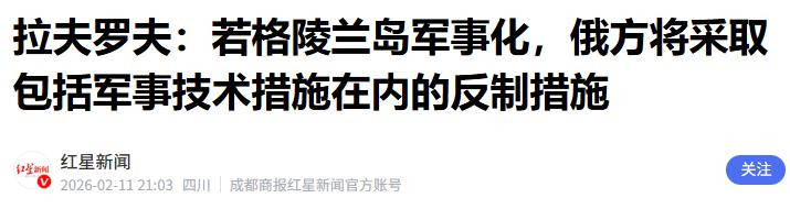 俄罗斯外长明确表示,如果格陵兰岛走向军事化,俄罗斯将采取包括军事手段在内的反制措施,绝不姑息。
